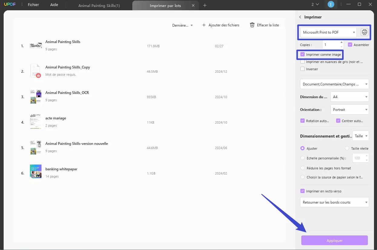 Méthode 2. Pour imprimer un PDF en tant qu'image par lots, lancez UPDF, cliquez sur « Outils > Imprimer » dans l'interface. Après télécharger tous les fichiers PDF, choisissez « Microsoft Print to PDF », activez « Imprimer comme image », puis cliquez sur « Imprimer » pour imprimer les PDF en tant qu'images par lots.