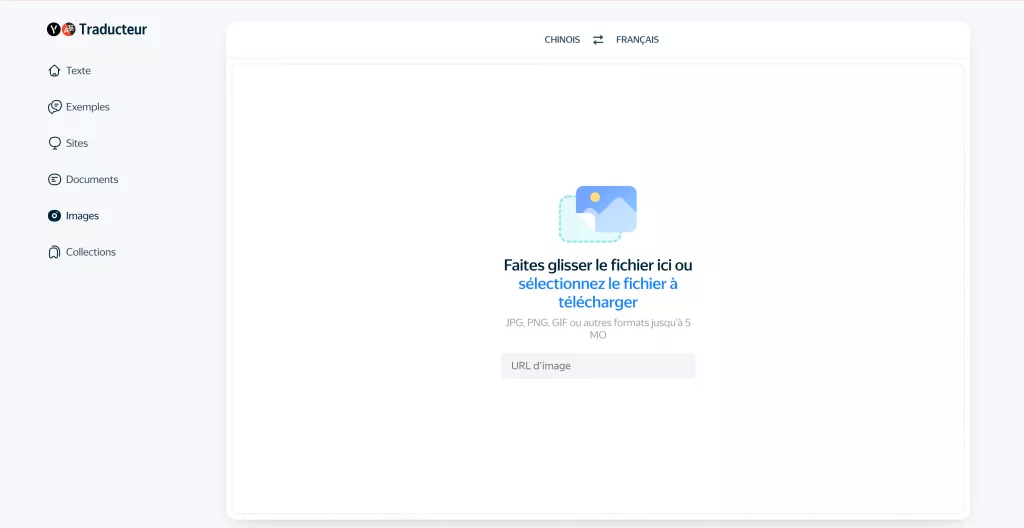 Yandex est un outil de traduction OCR accessible depuis un navigateur web. Il suffit de téléverser une image, de sélectionner la langue, et l’outil traduira automatiquement l’image du chinois vers le français. Il s’agit d’un outil simple et gratuit, sans paramètres avancés : vous importez le fichier et choisissez la langue. Cette simplicité le rend facile à utiliser, mais elle limite également le contrôle sur le résultat final.