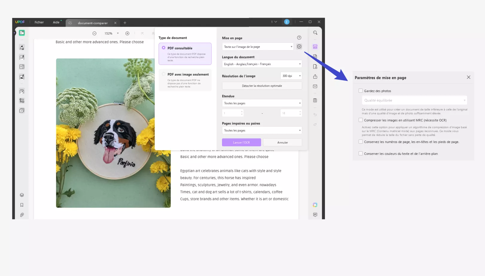 Étape 3 : Une fois installé, fermez la fenêtre et naviguez vers le même bouton pour accéder à l'outil OCR via UPDF. Vous pouvez modifier la « Mise en page », la « Langue du document », la « Résolution de l'image », « Etendue de pages » et les « Pages paires ou impaires ». Pour plus de paramètres de mise en page, vous pouvez cliquer sur l'icône de l'engrenage pour les extensions. Pour le « PDF avec image seulement », vous pouvez modifier les paramètres « Gardez des photos », « Étendue de page » et « Pages paires ou impaires ». Vous pouvez ajuster ces paramètres en fonction de vos besoins.