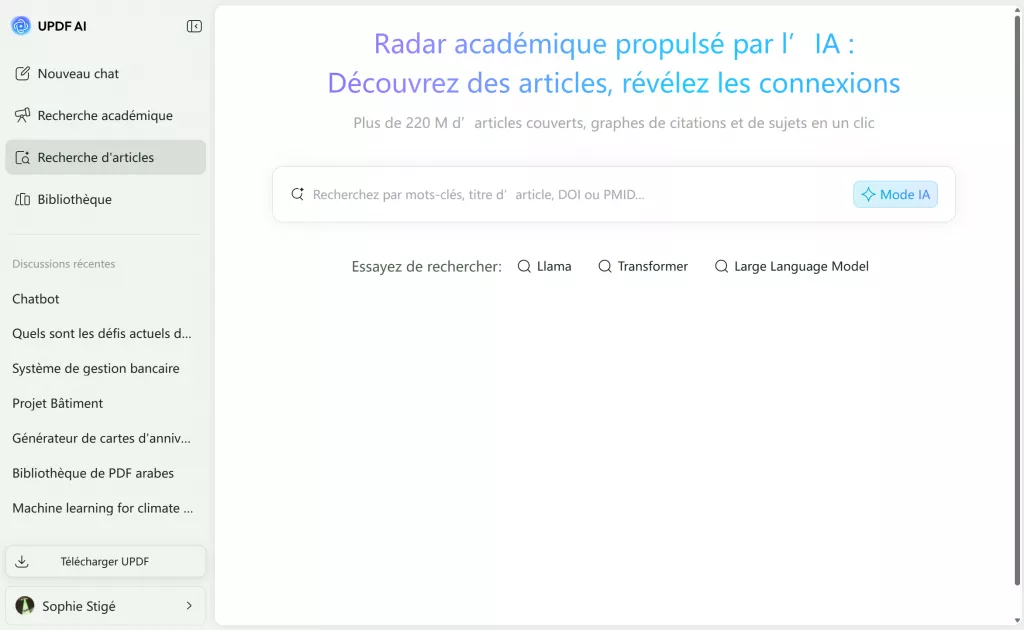 La recherche d'articles universitaires prend souvent plus de temps que prévu. Vous passez d'un site à l'autre, parcourez de longs textes et ne savez toujours pas ce qui est vraiment utile. C'est là qu'intervient la recherche d'articles d'UPDF AI. Elle est conçue pour vous aider à trouver les articles qui vous intéressent plus rapidement, sans allers-retours.