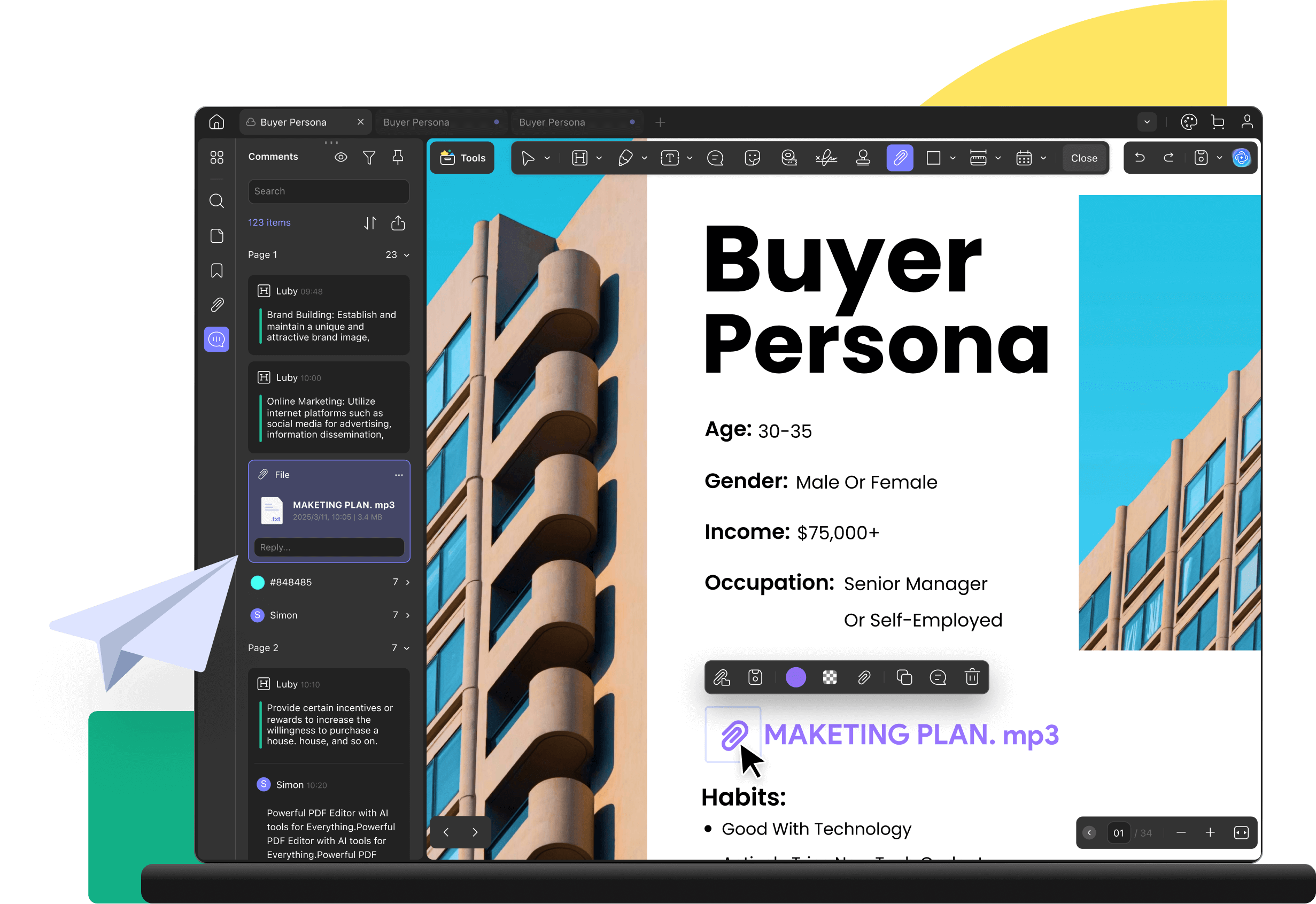 UPDF 支援插入豐富的附件,對 PDF 文件補充說明,同時可透過多種便捷的分享方式,將你的文件傳輸出去,讓文件演示更專業,還能輕鬆完成共享協作。
