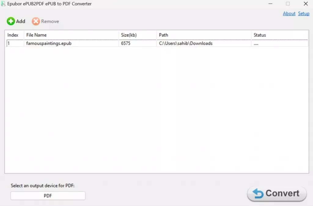 在您的設備上安裝EPUB轉PDF轉換軟體,然後啟動程式。現在,選擇所需的EPUB檔案,指定PDF作為輸出格式,然後開始轉換。轉換完成後,從指定的輸出資料夾中檢索轉換後的PDF,以存取轉換後的檔案。