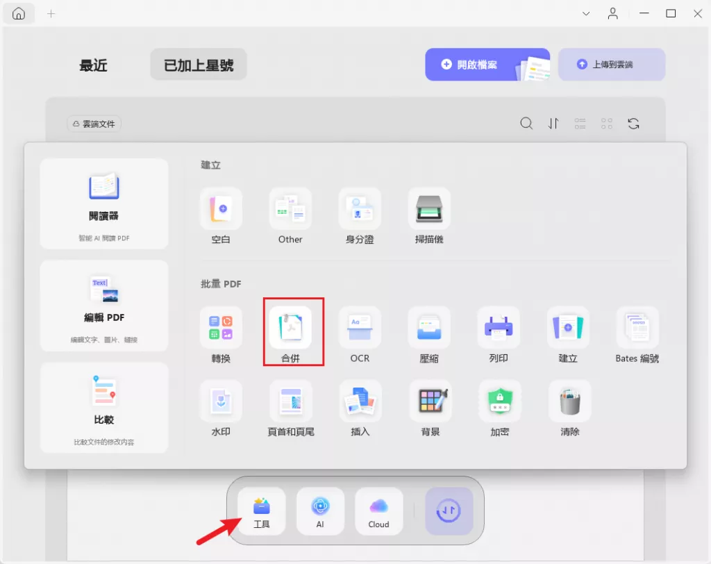 與前一種方法相同,雙擊桌面圖示即可開啟 UPDF。若無桌面圖示,也可透過 Windows 搜尋功能輸入「UPDF」並按下回車鍵。開啟 UPDF 後,點擊「工具」,從 5 個批次功能選項中選擇「合併」。接著會進入新畫面,提示您新增檔案。