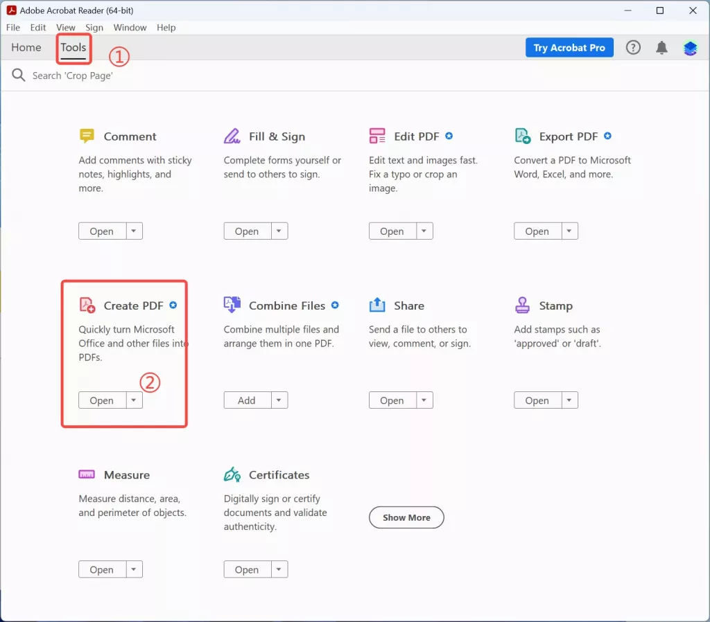 選擇 “創建 PDF”:點擊頂部工具列的 “文件” 或 “工具”,選 “創建 PDF”,跳轉到新頁面後,點擊藍色按鈕從電腦選你想要的文件。