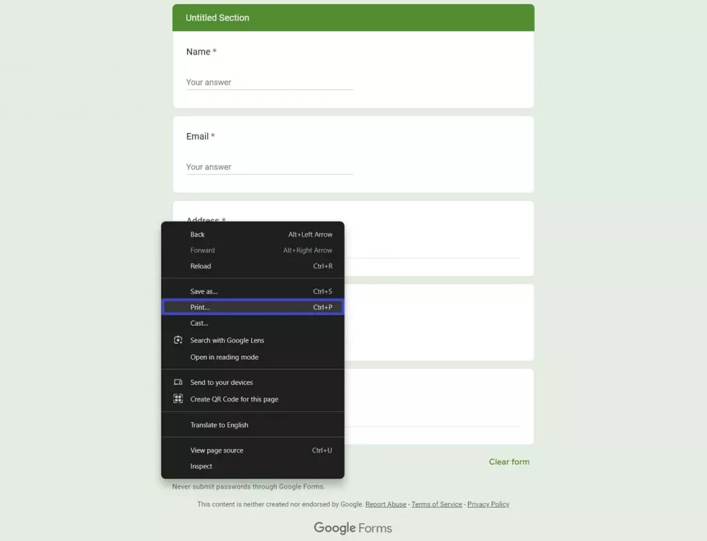 - 開啟列印功能:首先線上取得網頁表單的存取權限,在表單畫面上按滑鼠右鍵,彈出選項清單後點選「列印」。