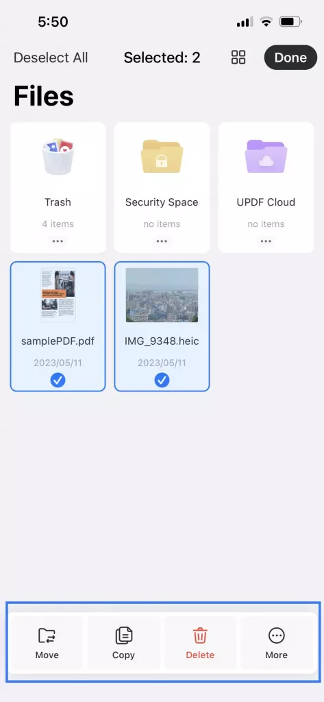 UPDF 會把選好的每個 JPG 檔案都轉成 PDF 並儲存到設備上,新創建的 PDF 檔案會和原來的 JPG 檔名一樣。