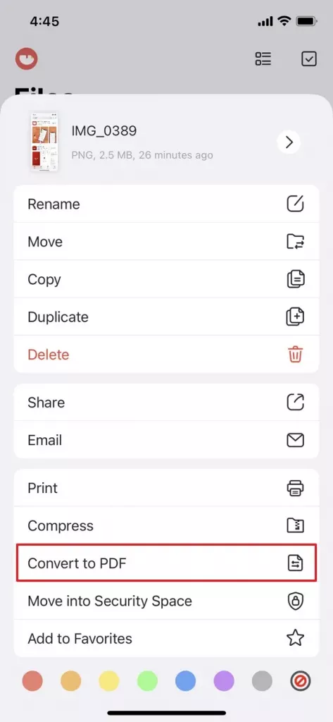 現在圖片已經在檔案應用程式裡了,打開這個應用程式,長按圖片,選擇 “創建 PDF”,新創建的 PDF 檔案就會保存在檔案應用程式裡。