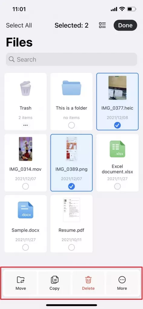 - 找到你想存為 PDF 的照片,長按檔案圖示選中它,或者點擊 “…” 圖示。