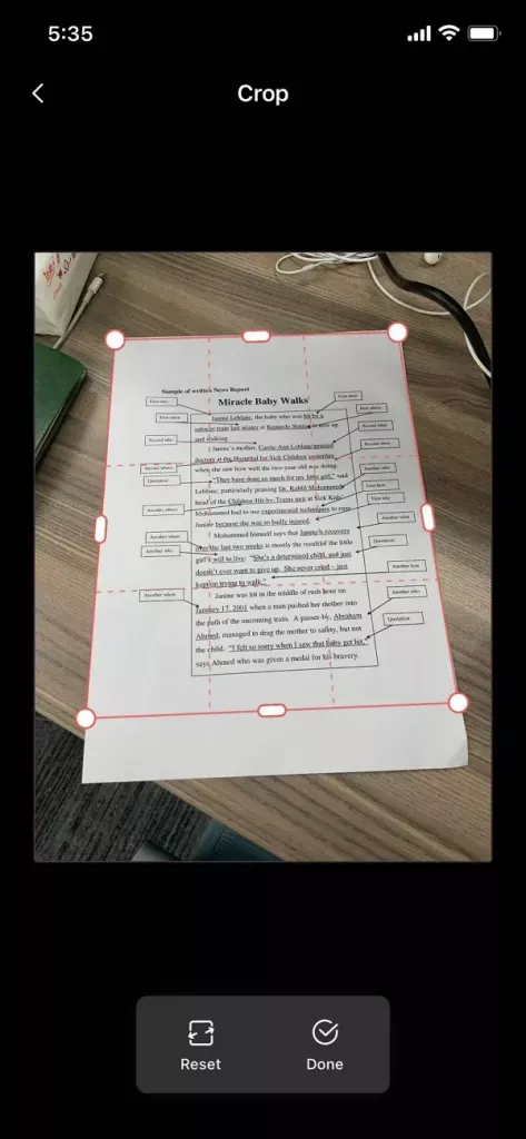 給你想存為 PDF 的文件拍照,UPDF 有自動捕捉功能,幫你掃描想保存為 PDF 的區域。掃描後,你可以花點時間裁剪、旋轉或添加濾鏡,確保圖片清晰。