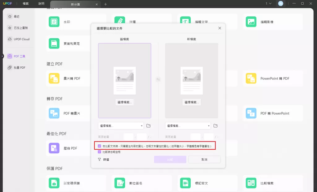 此外,您可以在比較時忽略文字屬性和空格,這很有幫助。它也允許您比較 Word、Excel、PPT 等格式的文件,因為它支援將這些文件轉換為 PDF 格式。