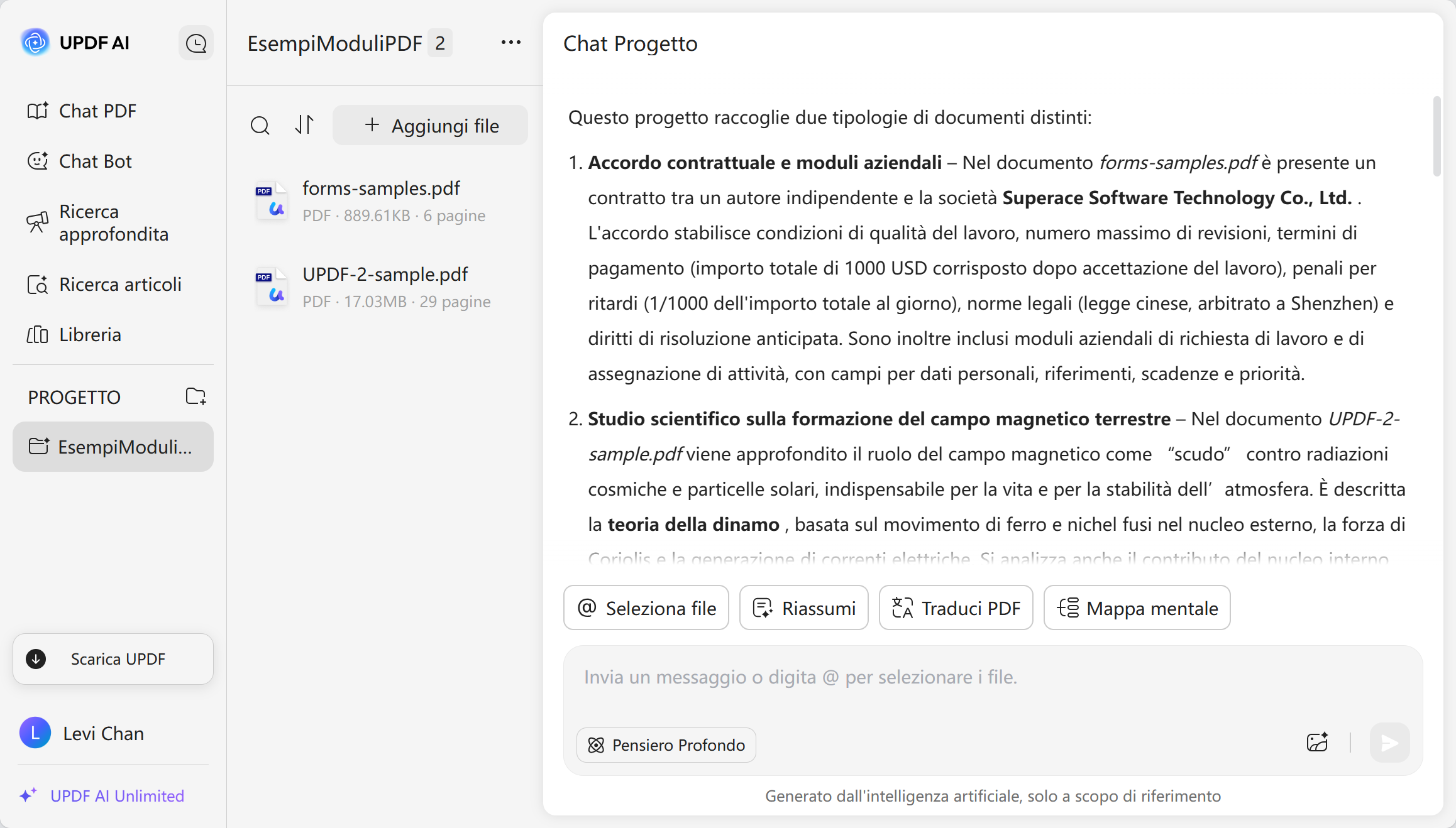 UPDF AI analizzerà istantaneamente tutti i PDF caricati, estrarrà le intuizioni chiave e genererà automaticamente una Panoramica del Progetto strutturata.