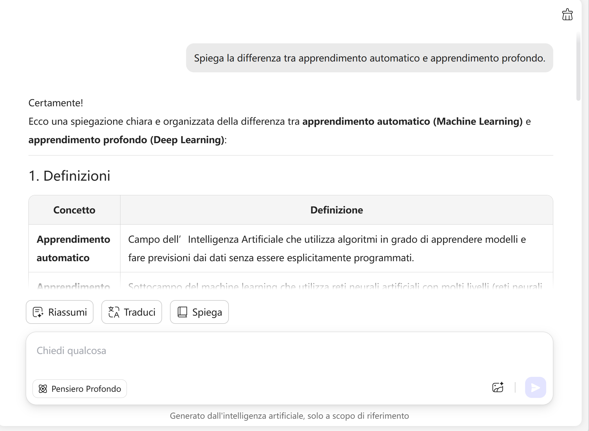 Chat Testuale: Se vuoi solo una chat rapida basata su testo, digita la tua domanda o comando e premi Invio. Esempio di domanda: "Spiega la differenza tra machine learning e deep learning." Per approfondimenti più dettagliati, clicca DeepThink nell'angolo in basso a sinistra della chat box.