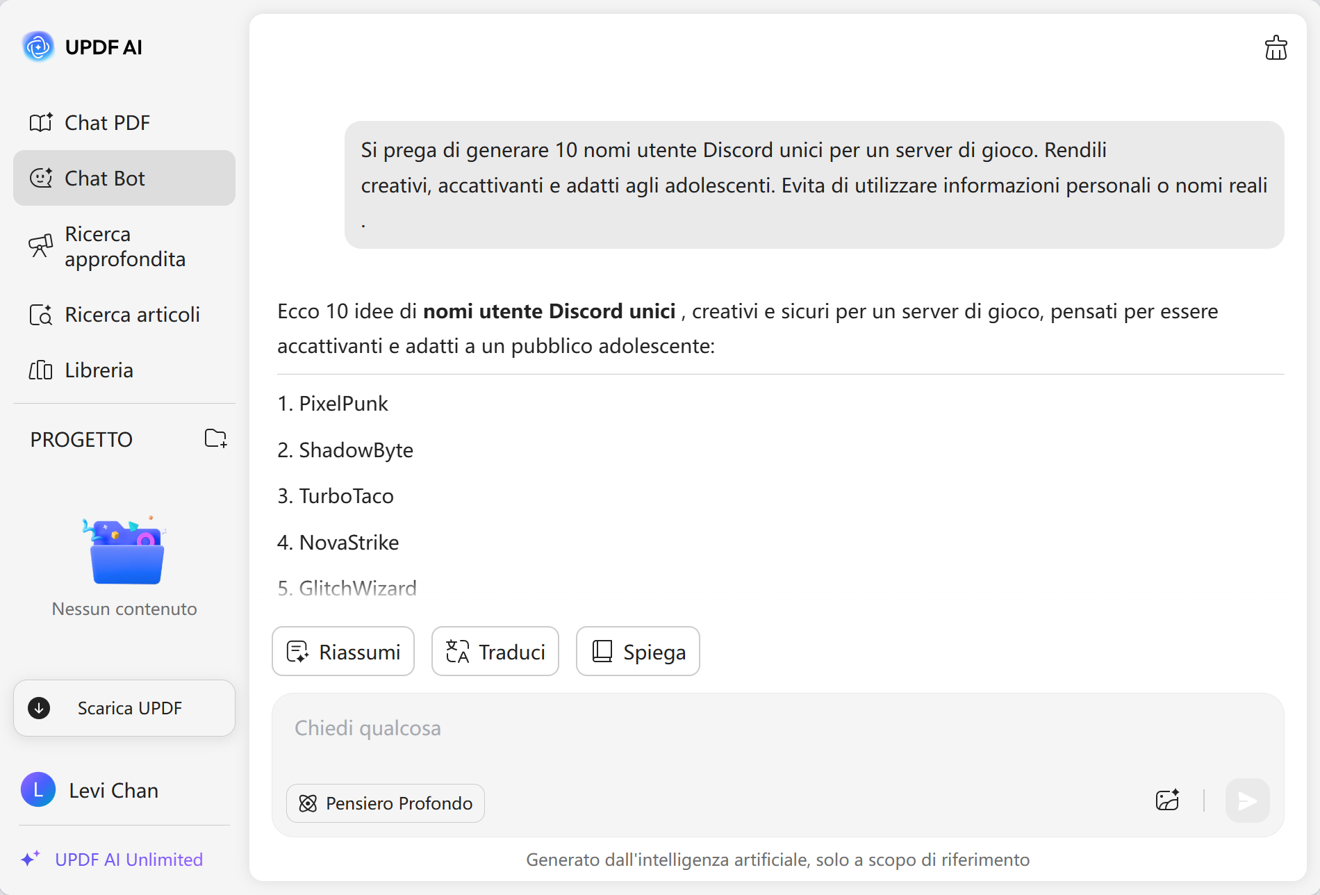 Le persone che si sono appena iscritte a Discord hanno bisogno di un username unico per iniziare il loro account. UPDF AI li aiuta a generare istantaneamente nomi creativi e disponibili.
