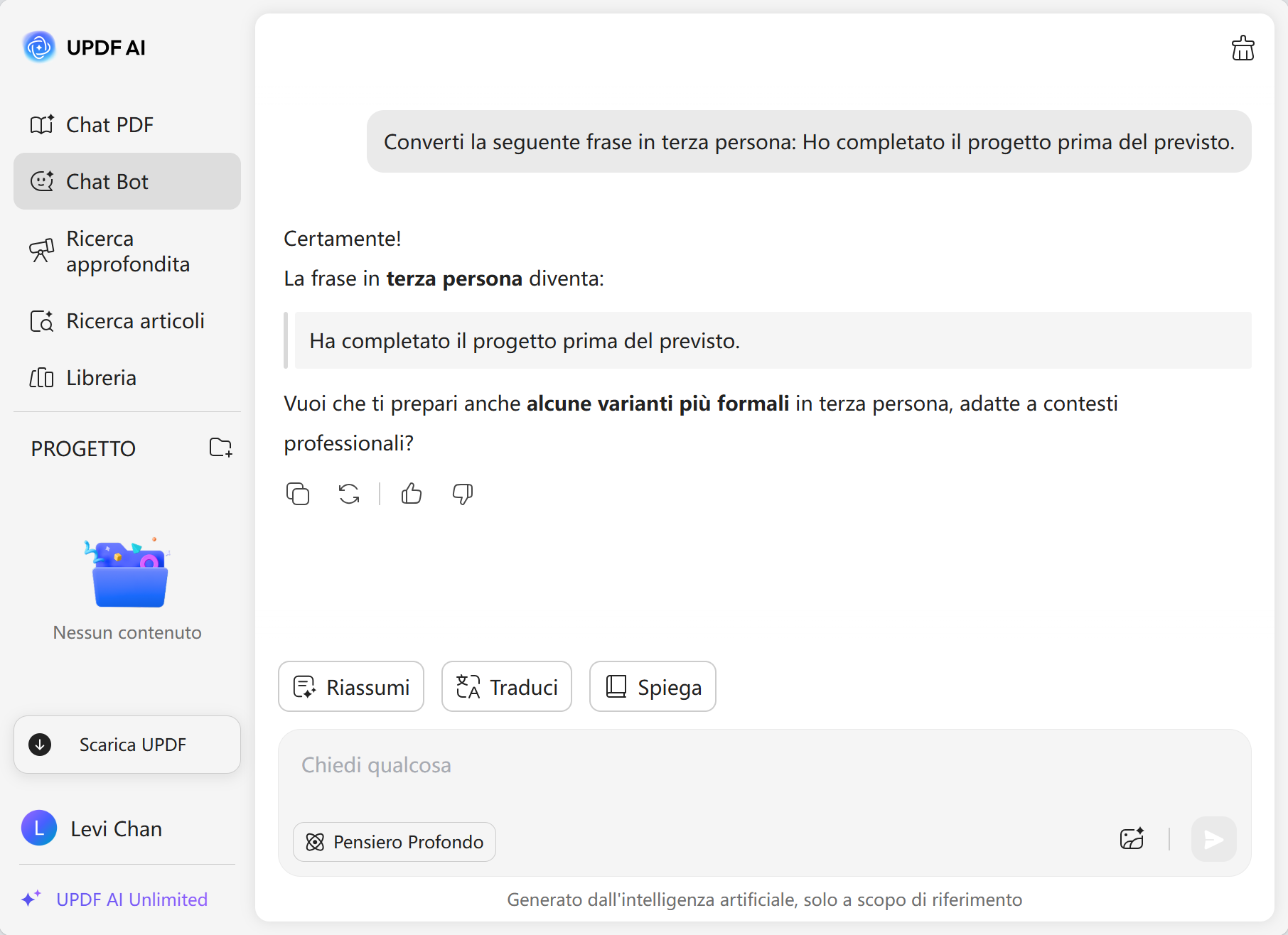 Per iniziare, inserisci il testo che vuoi convertire e includi un prompt, ad esempio "Converti il seguente in terza persona: Ho completato il progetto in anticipo rispetto al programma." Puoi anche descrivere i tuoi requisiti specifici, come il tono o lo stile preferito.
