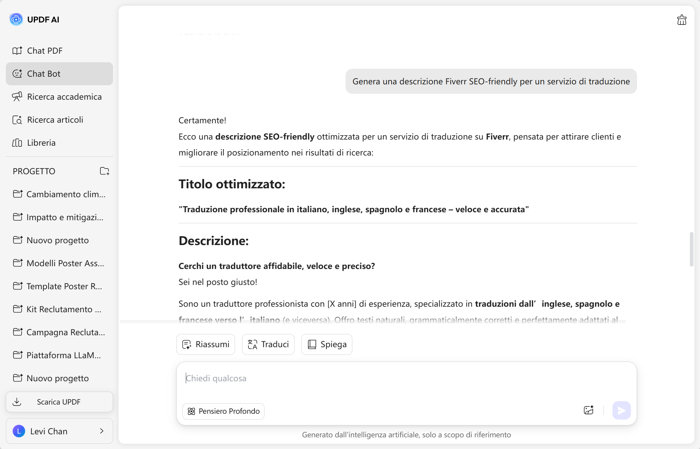 Sì. UPDF AI supporta più lingue, permettendoti di creare descrizioni Fiverr in inglese, spagnolo, arabo, francese e altro. Basta specificare la lingua preferita nel prompt e l'AI genererà una descrizione fluida e localizzata su misura per quel mercato.
