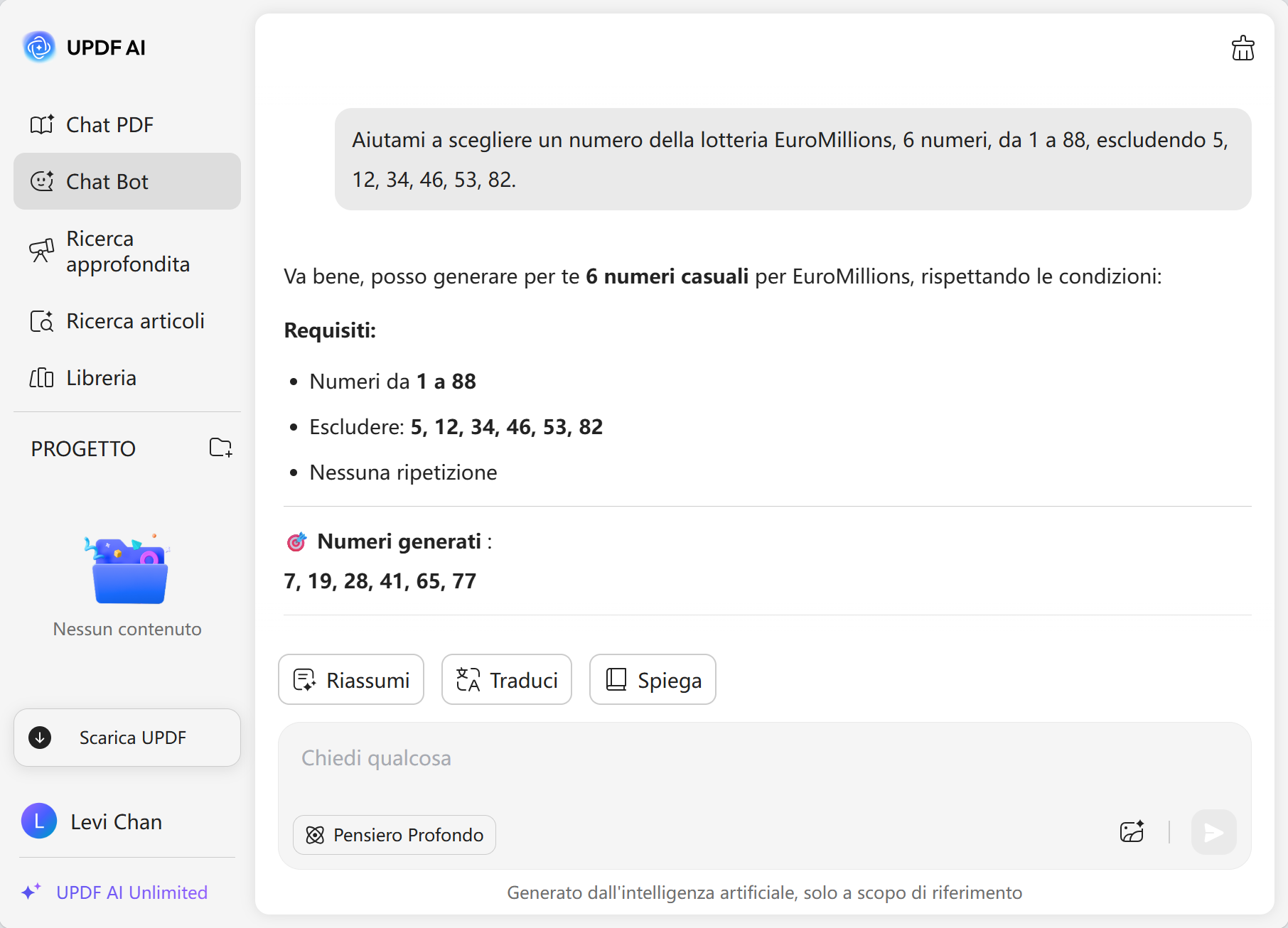 Con il Generatore di Numeri della Lotteria UPDF AI, puoi personalizzare la selezione dei numeri in base alle tue esigenze. Imposta l'intervallo di numeri, escludi numeri specifici e aggiungi altre preferenze per generare combinazioni di lotteria intelligenti, casuali e imparziali create appositamente per te.