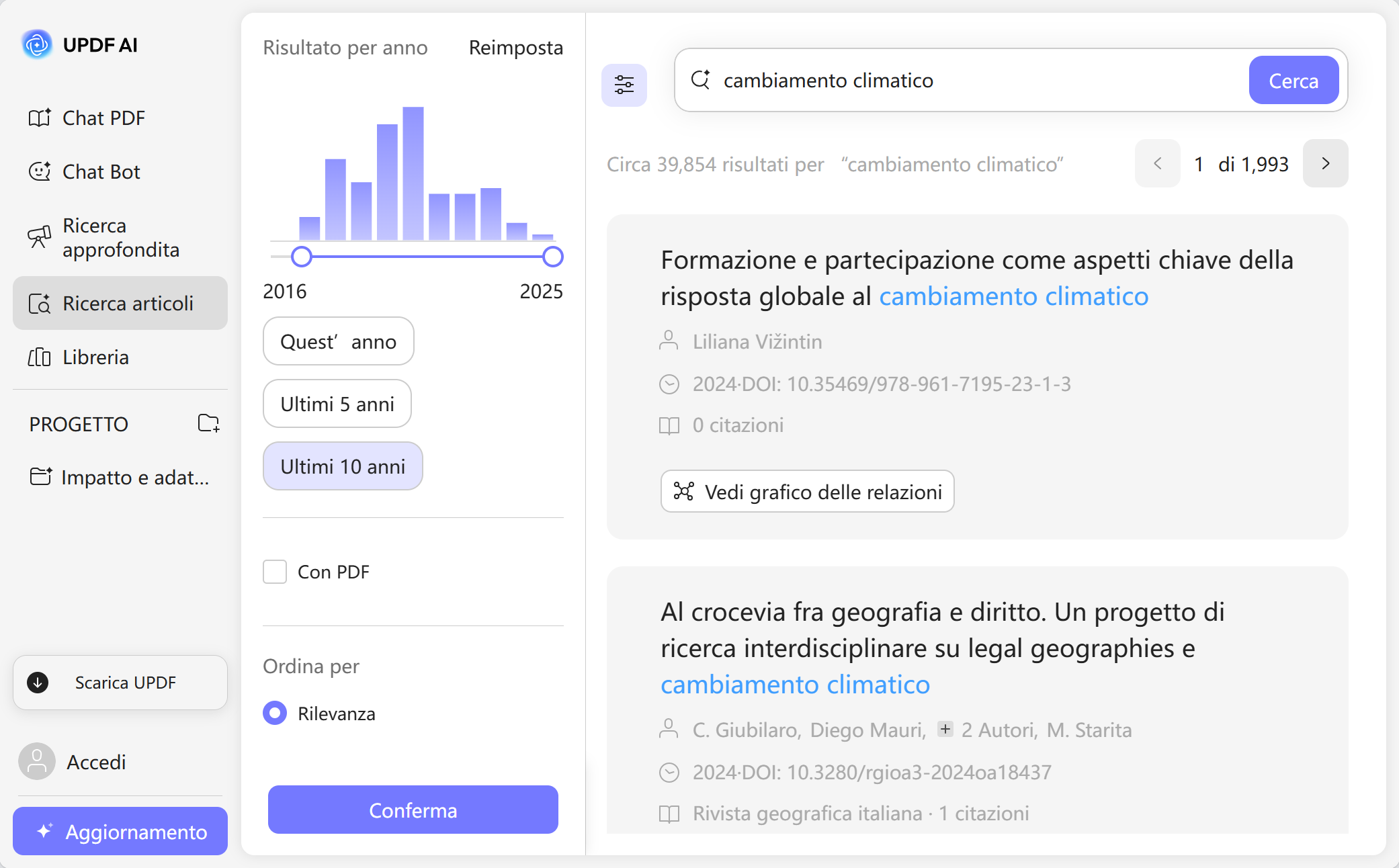 Una volta caricati i risultati, puoi cliccare sull'icona "Filtro" per filtrare i risultati della ricerca e trovare i paper che corrispondono alle tue esigenze.
