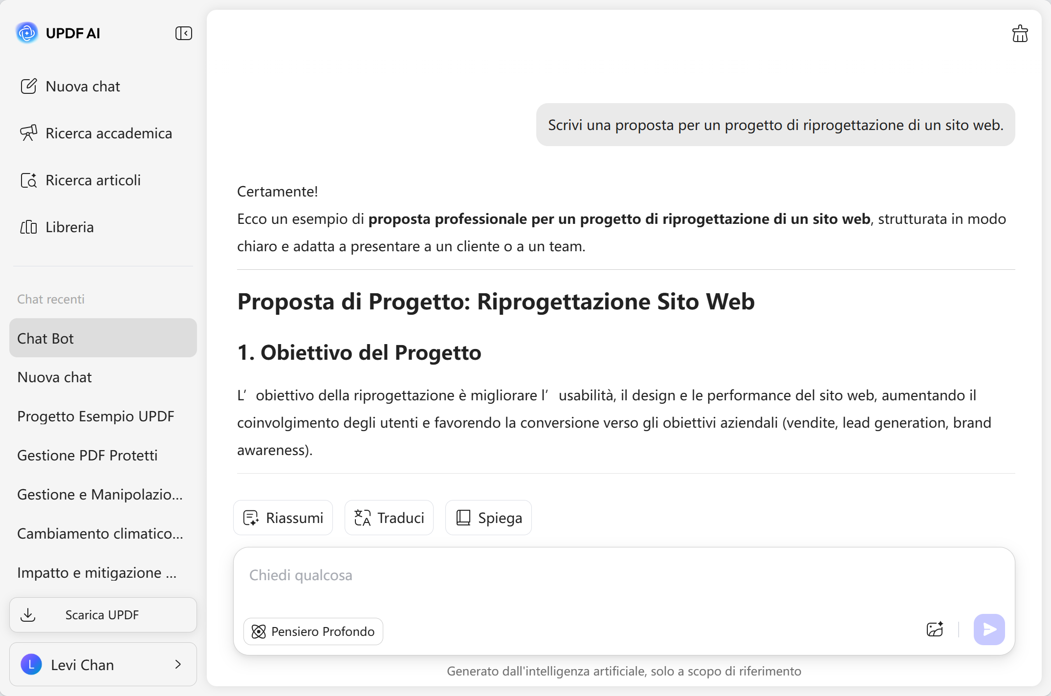 Clicca Invia e UPDF AI crea istantaneamente una proposta chiara e professionale. Se vuoi modifiche, adatta il tuo prompt e rigenera.