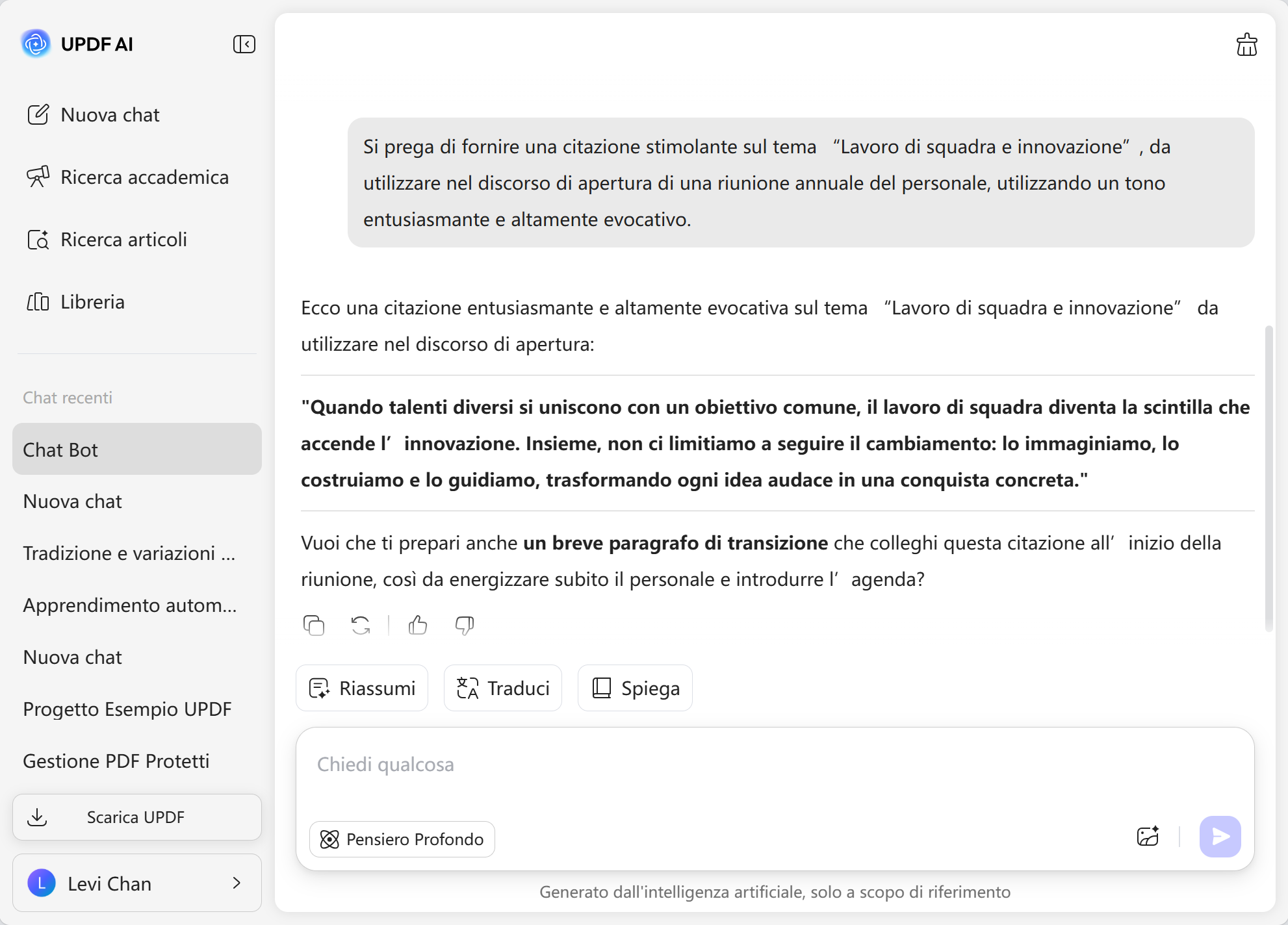 Per i professionisti, il Generatore di Citazioni UPDF AI è vitale per costruire marchi personali e amplificare l'impatto dei discorsi. Genera dichiarazioni incisive per presentazioni professionali o potenti chiamate all'azione in discorsi pubblici. Le citazioni aumentano la tua autorità, aiutandoti a distinguerti nel panorama aziendale competitivo.