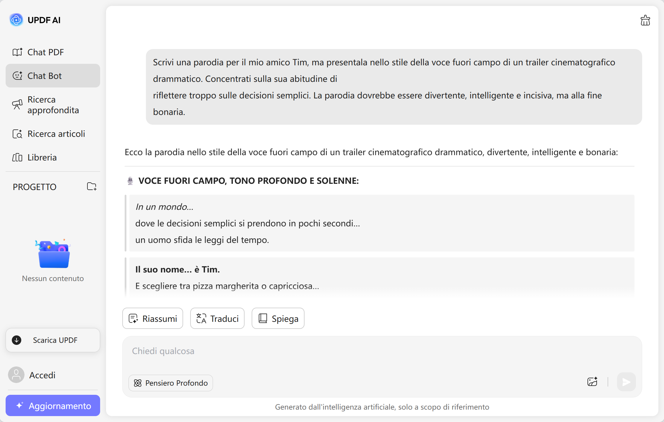 La vuoi spiritosa, sarcastica, da meme o semplicemente sciocca? Di' semplicemente a UPDF AI il tuo stile e lui cambierà marcia all'istante—che tu abbia bisogno di una battuta sarcastica per la chat di gruppo o di una roast da meme che sembra uscita direttamente da TikTok. Vedi come il tuo chef comico personale: tu scegli il sapore e lui serve la roast calda e pronta, su misura per il tuo pubblico.