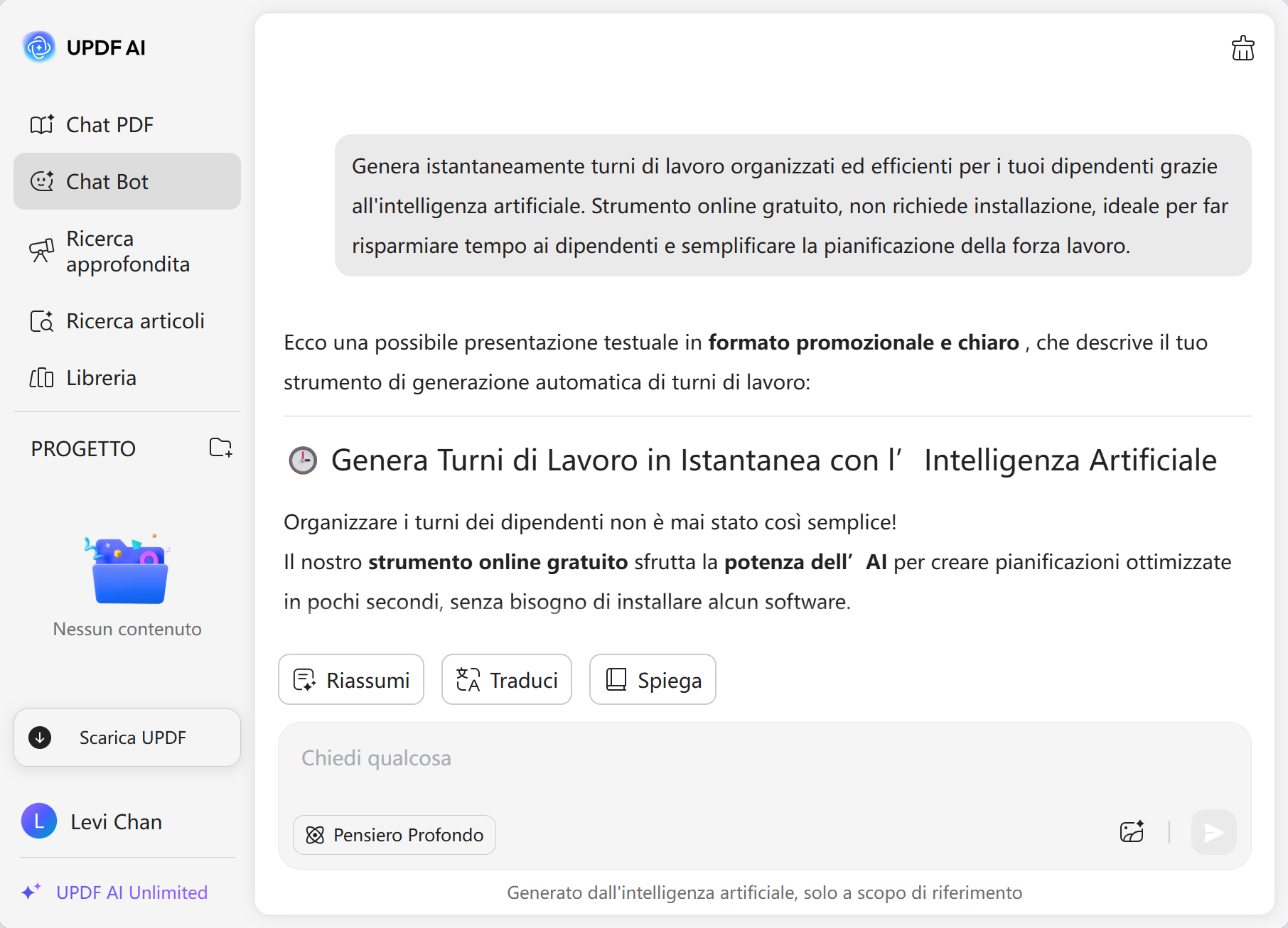 La programmazione manuale spesso porta a scadenze mancate o riunioni doppie. Il Generatore di Programmazioni UPDF AI per Dipendenti elimina gli errori umani organizzando intelligentemente i calendari, garantendo un coordinamento senza soluzione di continuità tra compiti, riunioni e progetti mantenendo tutti sulla buona strada.