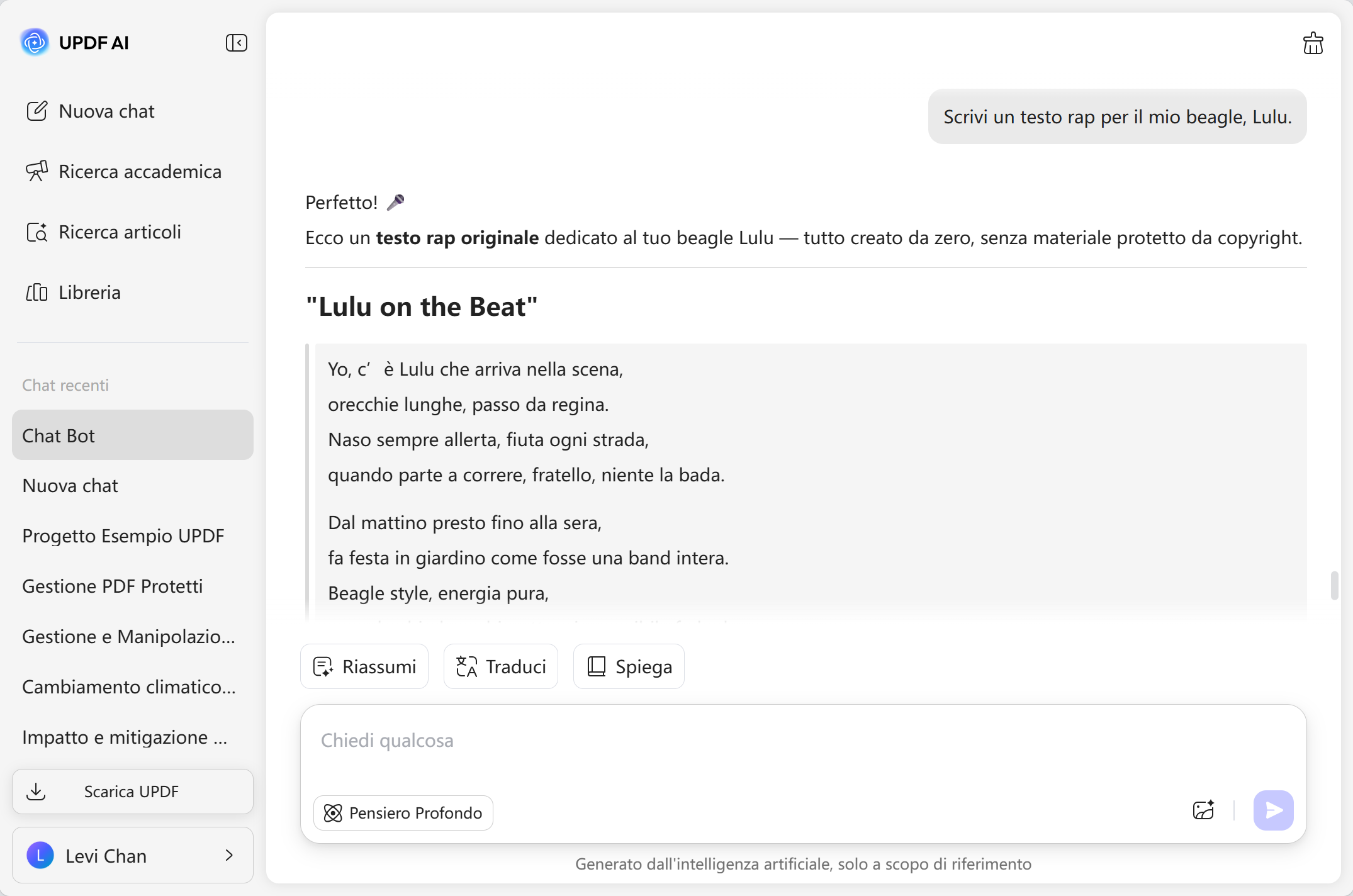 Che tu stia facendo musica, video, compiti scolastici o contenuti di marketing, UPDF AI fornisce testi personalizzati che si adattano ai tuoi obiettivi e flusso di lavoro.