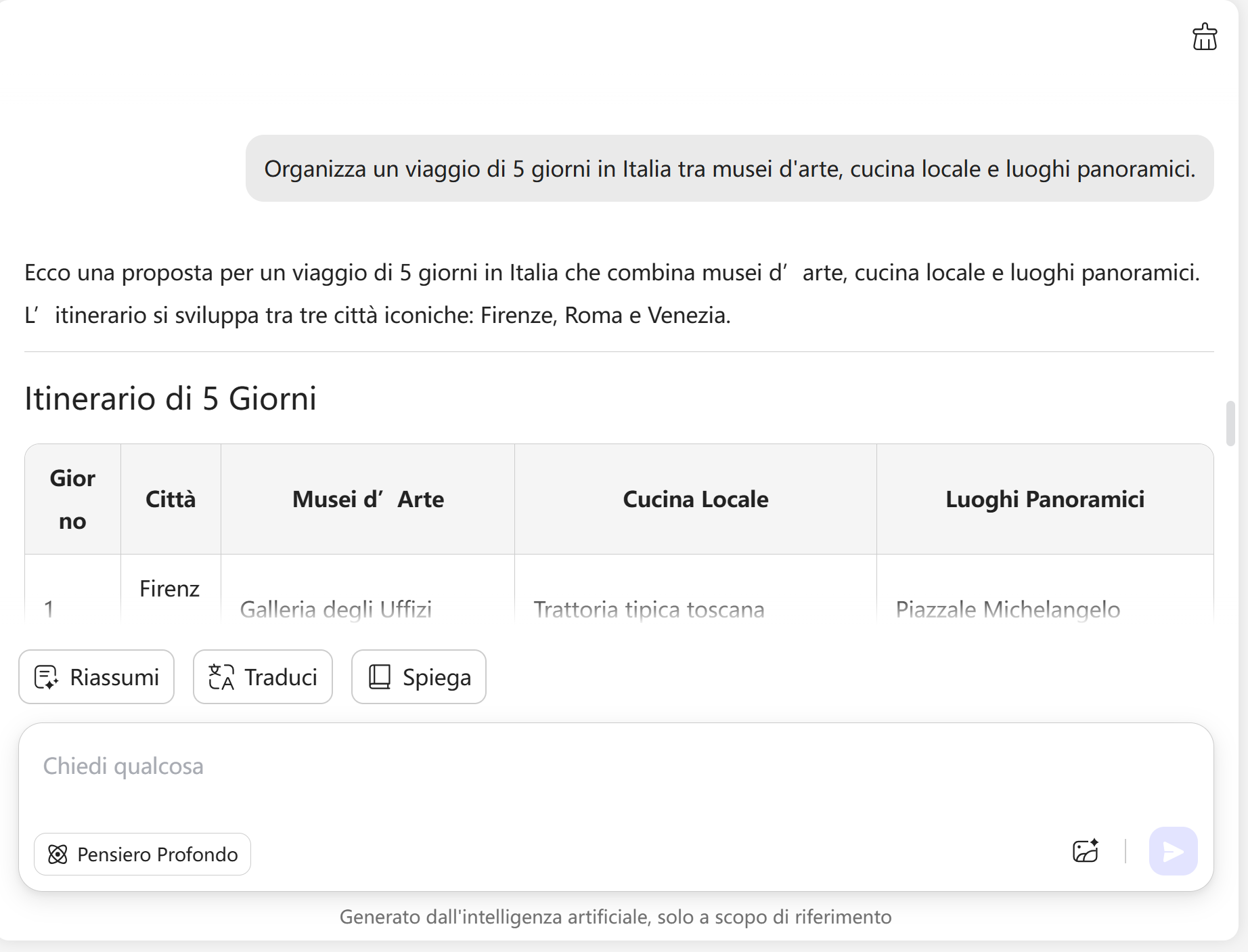 Pensa alla tua destinazione e a cosa desideri dal viaggio. Ad esempio: "Pianifica un viaggio di 5 giorni in Italia con musei d'arte, cibo locale e luoghi panoramici." Digitalo nella chat di UPDF AI e premi Invio — il tuo piano di viaggio personalizzato sarà pronto in pochi secondi.