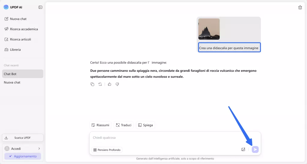 Per il Web: per consentire all'AI di UPDF di creare contenuti da un'immagine, inizia caricando l'immagine utilizzando l'icona “Immagine”. Inserisci il tuo prompt di testo (puoi chiedere di scrivere didascalie per un'immagine) per avviare la chat e l'AI produrrà una risposta. Puoi copiare l'output se soddisfa le tue esigenze o richiedere una rigenerazione se desideri un risultato diverso.