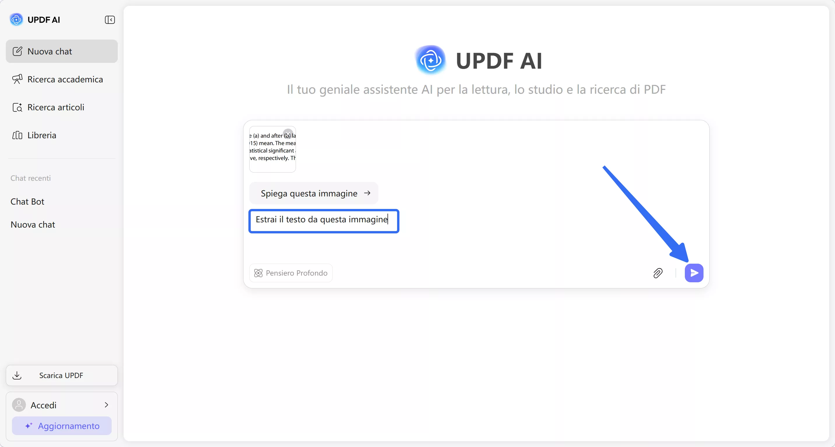 Per il Web: dopo aver effettuato l'accesso all'interfaccia UPDF AI, accedi alla schermata Chat Bot e tocca l'icona Immagine per caricare un'immagine contenente testo scritto a mano. Ora, basta chiedere all'AI di estrarre il testo scritto a mano e premere l'icona Invia per ottenere i risultati.