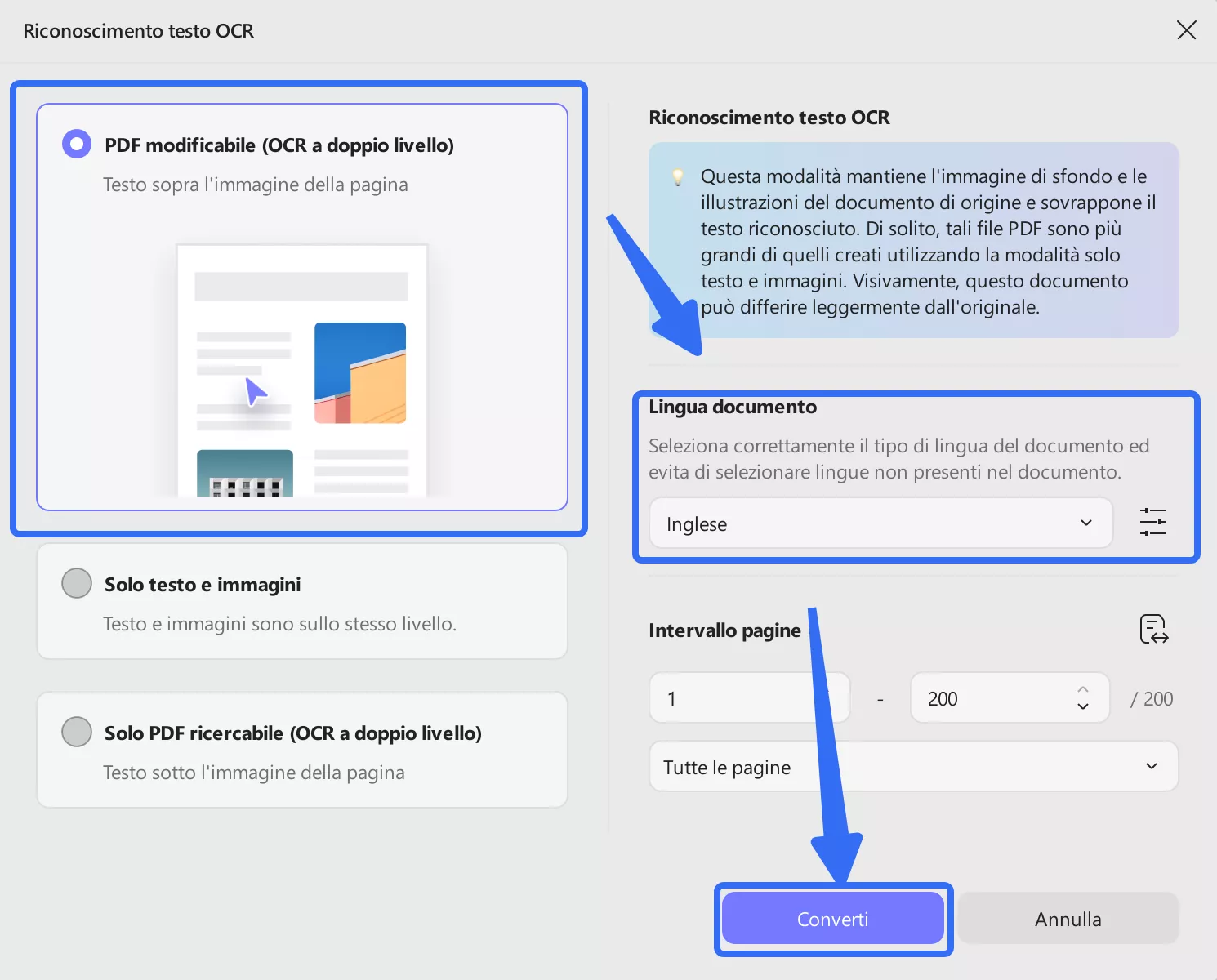 1. Seleziona “PDF Modificabile.” Scegli la lingua del documento come giapponese e seleziona un intervallo di pagine specifico. Poi, clicca su “Esegui OCR.