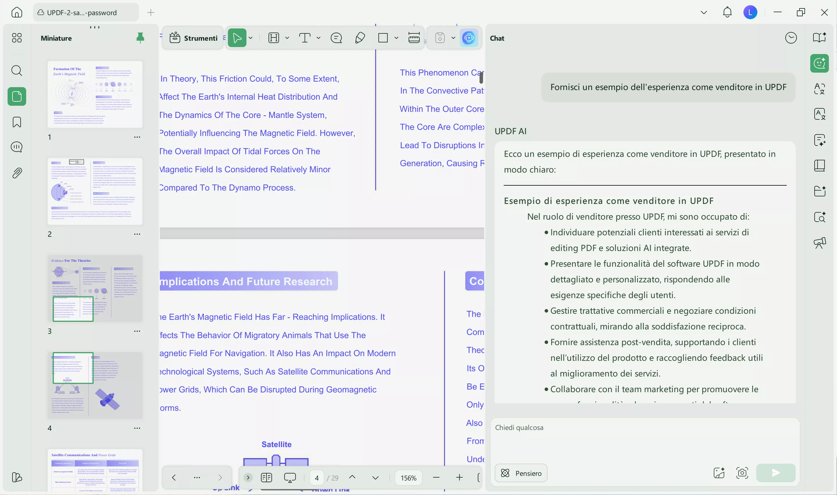 Ora vai al pannello laterale destro e troverai l'icona UPDF AI, clicca su di essa. Ad esempio, puoi inserire "Fornisci un esempio dell'esperienza come venditore in UPDF" e cliccare su "Invia". UPDF AI scriverà l'esperienza per te. Se è ciò di cui hai bisogno, puoi fare doppio clic sulla risposta, trascinare per selezionare e tenere premuto "Ctrl + C" per copiare il contenuto.