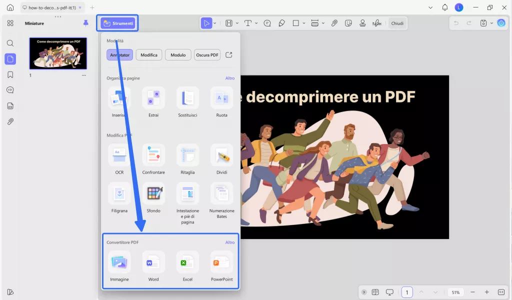 Se vuoi convertire immagini in altri documenti come Word o Excel, potrai aprire il file PDF convertito e selezionare ​Converti dalla barra degli strumenti sottostante per trasformare il PDF in altri formati.