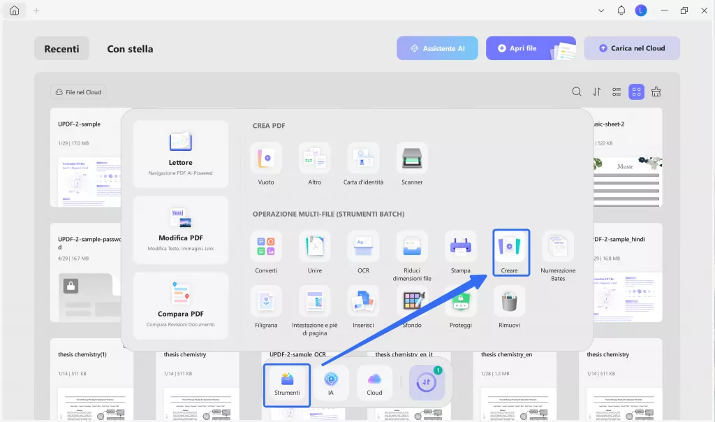 Passo 1. Vai su "Strumenti" nell'interfaccia di UPDF e scegli "Crea", aggiungendo tutti i file immagine che vuoi convertire in formato PDF.