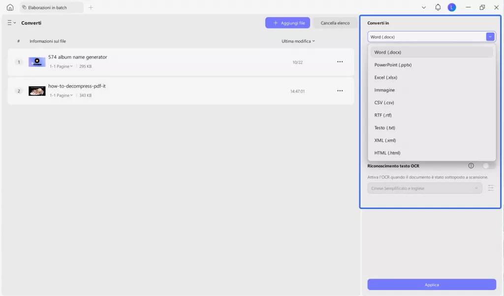 • Potrai convertire immagini in PDF, Word, Excel, PPT, RTF, CSV, HTML e altro ancora.