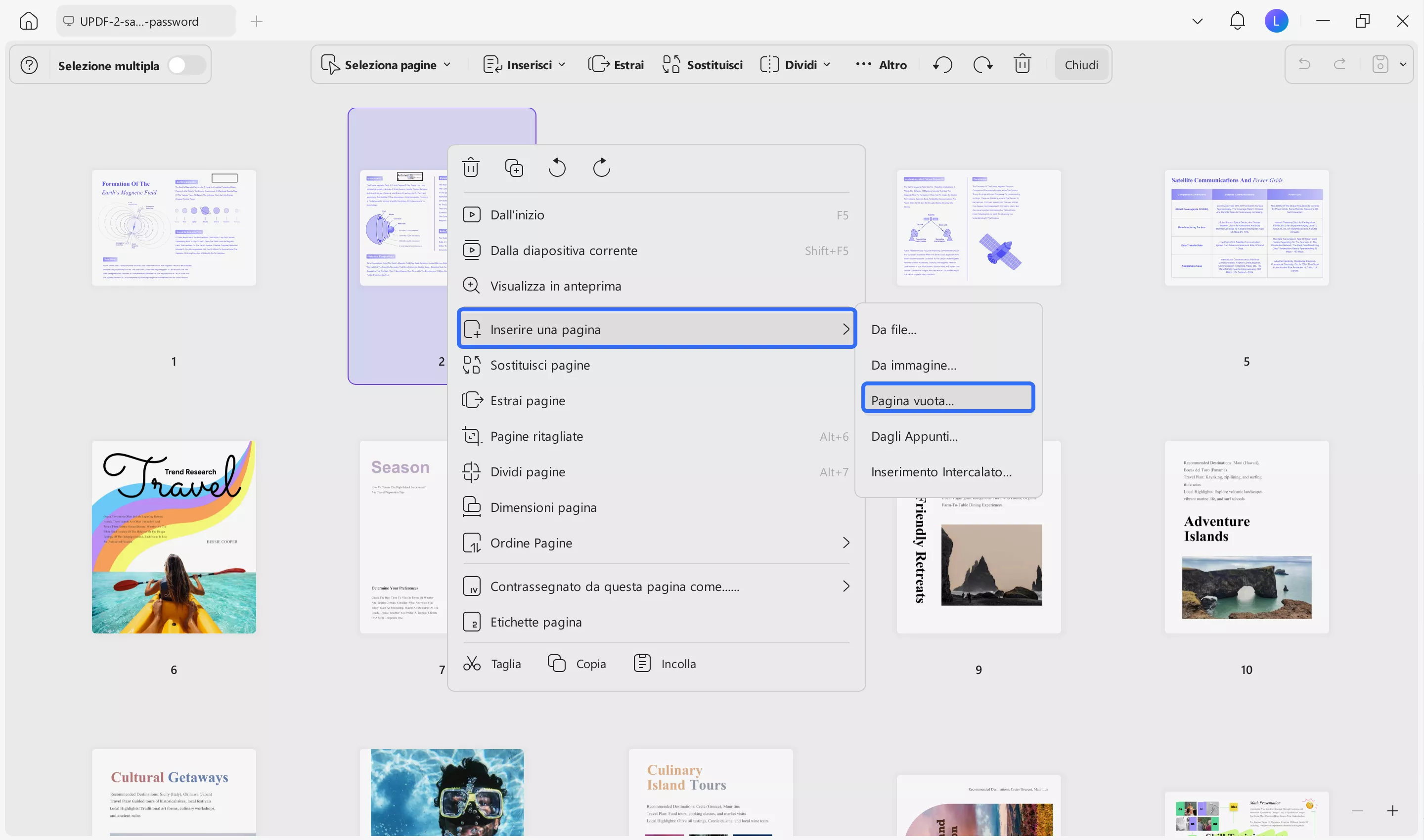Dopo aver caricato il PDF, vai sull'icona “Organizza” nella barra a sinistra e clicca su ‘Inserisci’ per selezionare l'opzione “Inserisci pagina vuota” e aggiungere una nuova pagina.