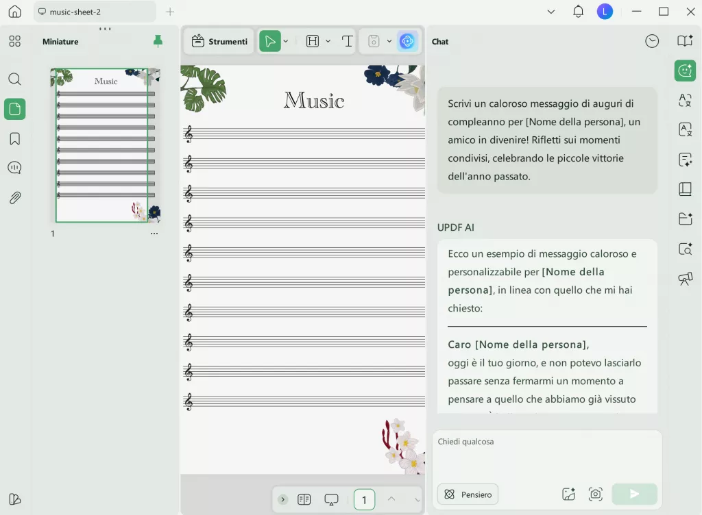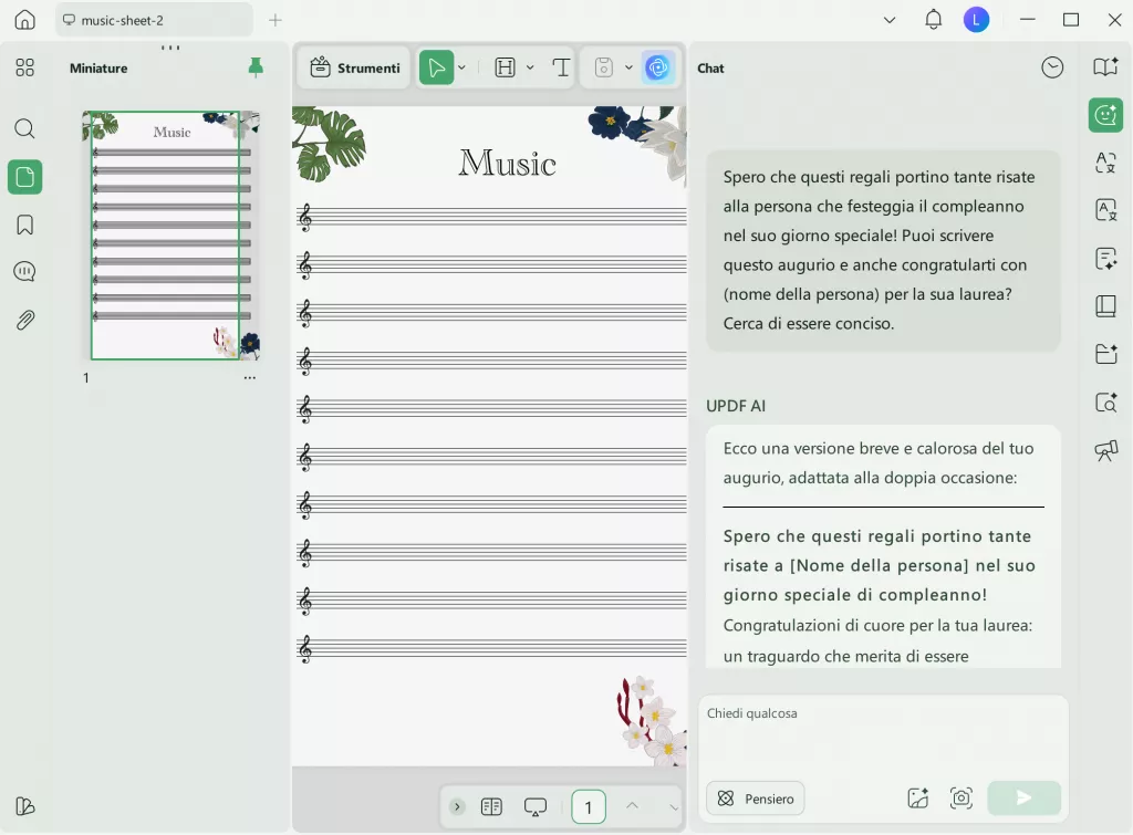 Se stai cercando degli auguri davvero unici, ti consigliamo di scoprire l'Assistente AI di UPDF. È possibile utilizzare UPDF per creare degli auguri di compleanno personalizzati e divertenti, pensati proprio per la persona a cui tieni. A prescindere che lo si utilizzi tramite il software UPDF offline o online su updf.ai, lo troverai molto utile. In più, sarà possibile provarlo cliccando sul pulsante qui sotto per scaricarlo sul tuo computer o visitando l'Assistente AI di UPDF online con i primi 30 suggerimenti gratuiti!