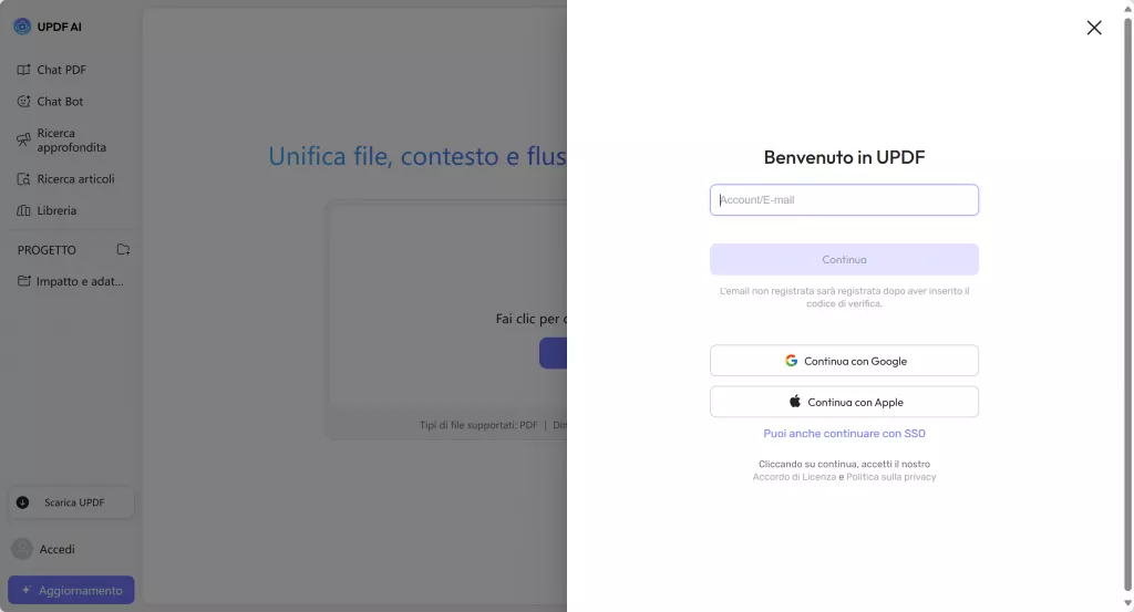 - Qui puoi effettuare il login con il tuo account UPDF oppure, se non ne hai uno, puoi registrarti facilmente.