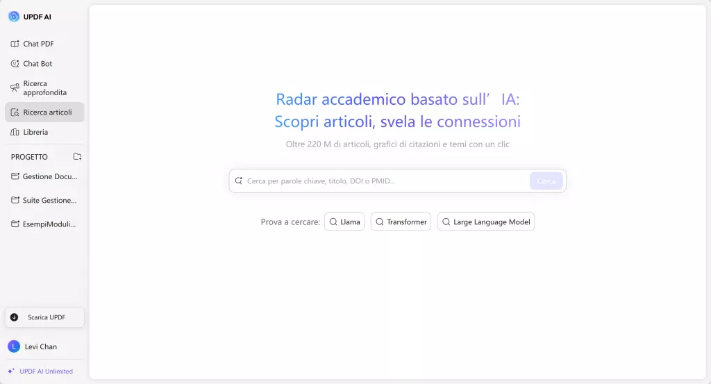 La ricerca di articoli accademici spesso richiede più tempo del previsto. Si passa da un sito all'altro, si sfogliano lunghi testi e non si è ancora sicuri di cosa sia effettivamente utile. È qui che entra in gioco la ricerca di articoli di UPDF AI . È progettata per aiutarti a trovare gli articoli giusti più velocemente, senza tutti quei continui avanti e indietro.
