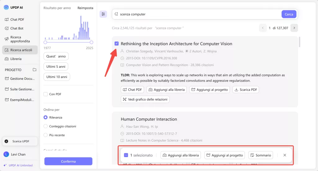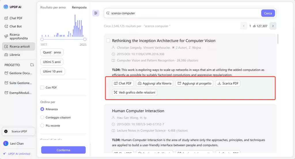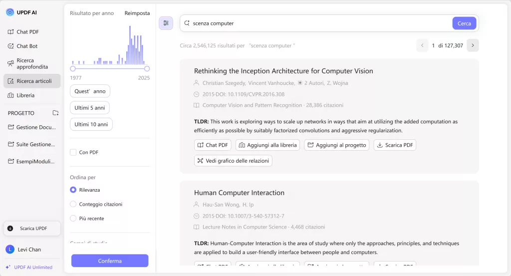 Trovare l'articolo giusto diventa più facile con i filtri integrati di UPDF AI Paper Search. Puoi filtrare i risultati della ricerca per trovare gli articoli che corrispondono alle tue esigenze. Una volta caricati i risultati, puoi interagire con ciascun articolo direttamente dall'elenco. Ecco come: