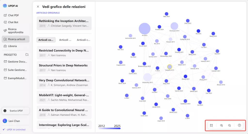 - Esplora il grafico delle relazioni per scoprire gli articoli collegati per argomento o citazioni.