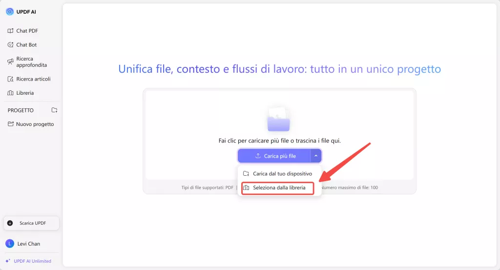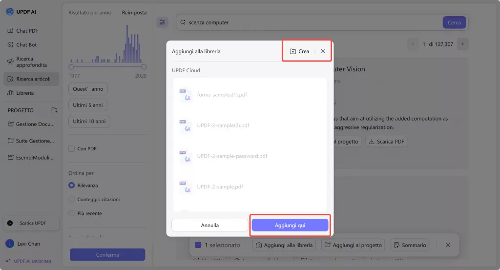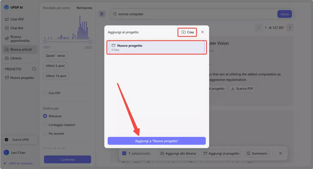 - Aggiungi al progetto: organizza il documento in base allo specifico progetto di ricerca su cui stai lavorando.