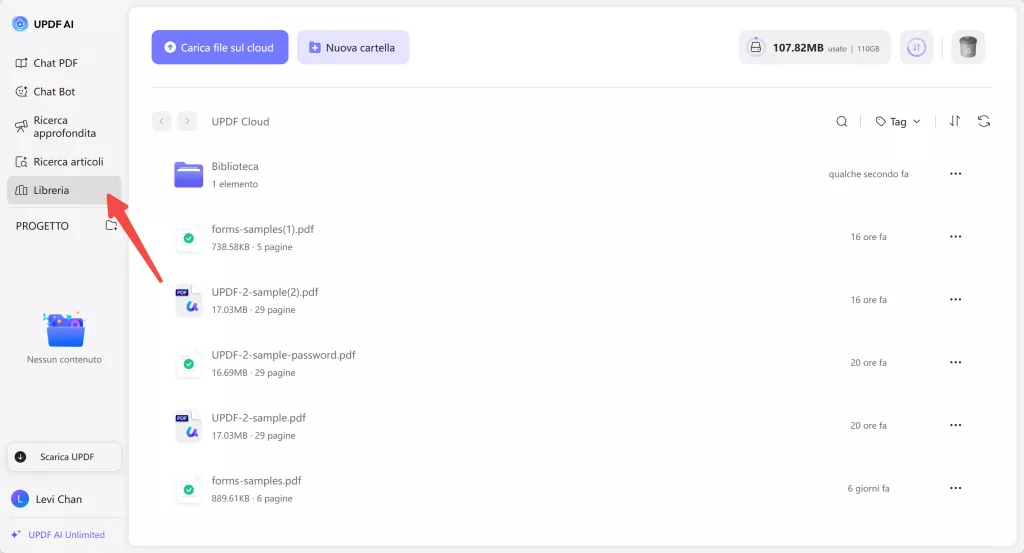 Puoi cliccare sul pulsante "Libreria" nel pannello di sinistra e accedere ai documenti di ricerca salvati.