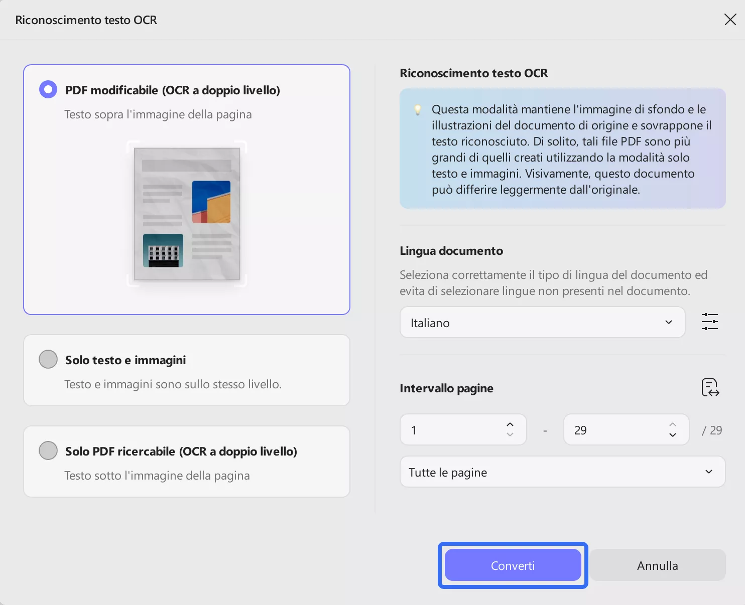 Dopo aver aperto il PDF, clicca su “Strumenti” e seleziona ‘OCR’ dalle opzioni. Quindi seleziona “Tipo di documento”, “Lingua del documento” e “Intervallo di pagine”.
