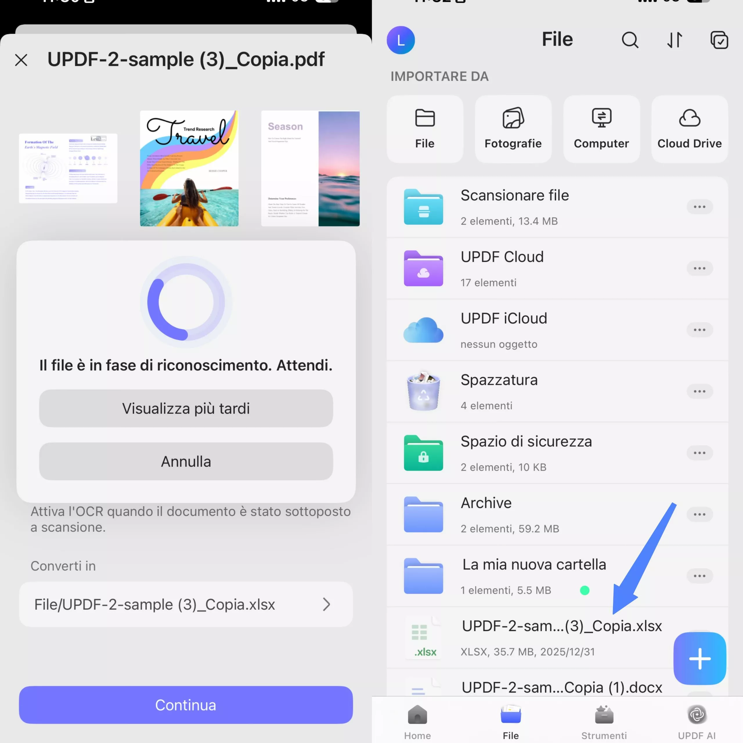 Se il PDF contiene dati, sarà possibile convertirlo in Excel e utilizzare il foglio di calcolo per eseguire calcoli e analisi dei dati in modo semplice. UPDF per iOS fornisce una conversione da PDF a Excel di grande precisione, mantenendo righe, colonne e numeri. Dai un'occhiata ai passaggi seguenti per convertire un PDF in Excel: