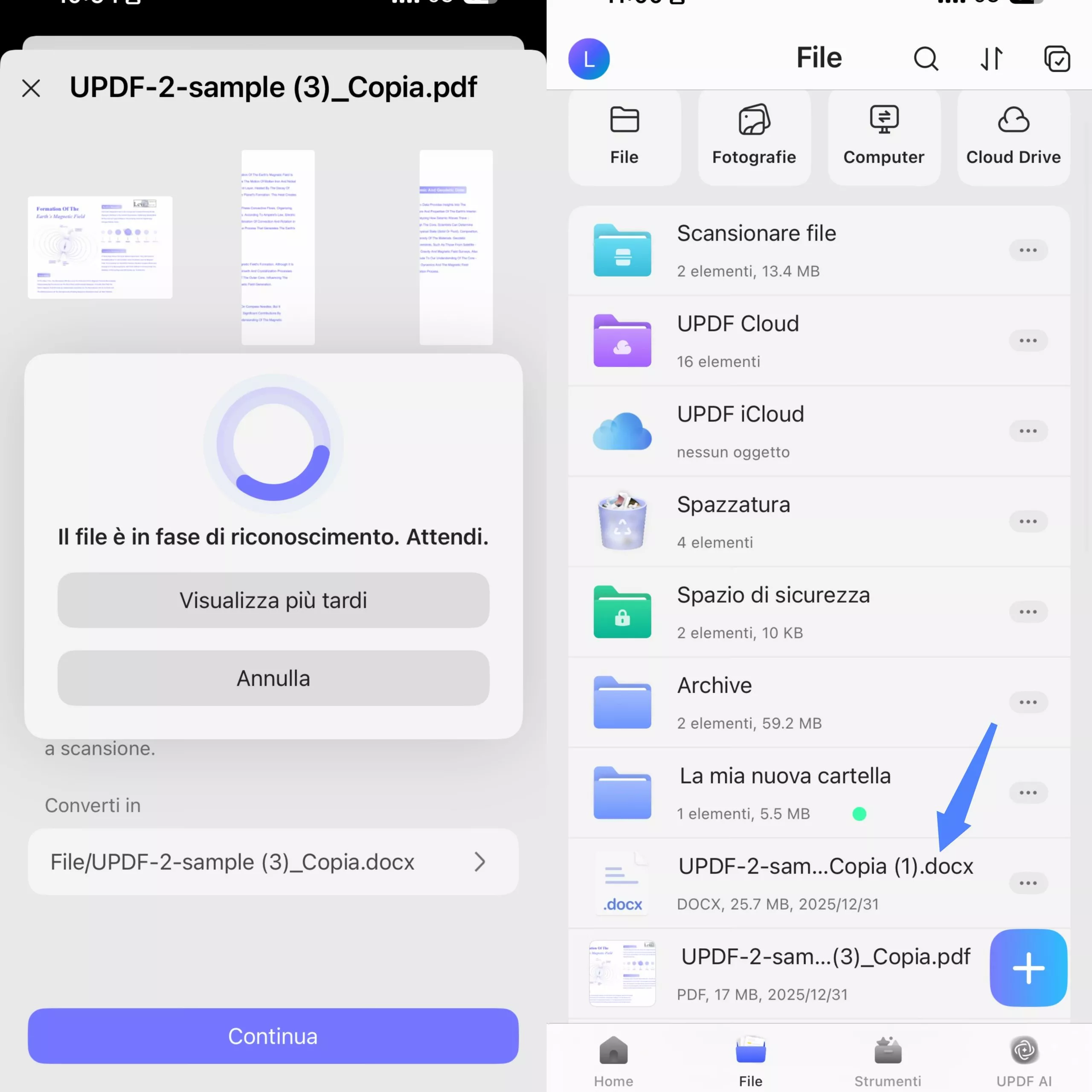 UPDF per iOS ora fornisce una funzione di conversione avanzata che permette di convertire PDF in Word, Excel, PowerPoint e formati immagine. L’app permette conversioni facili e rapide mantenendo intatti formato originale e qualità del documento.