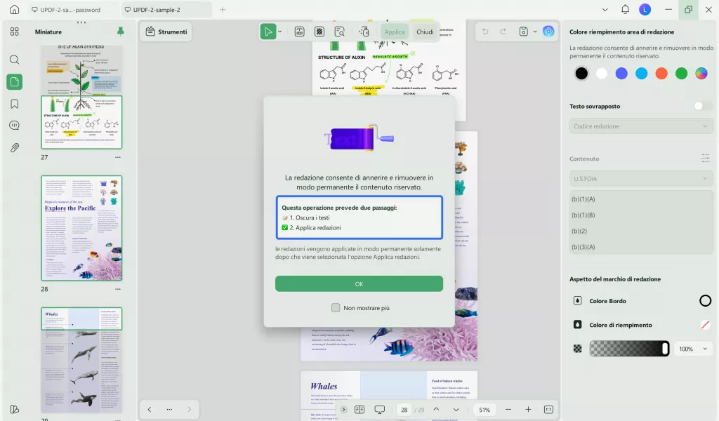 - Dopo aver scelto il colore di riempimento dell'area redatta, premere il pulsante Redigi per rimuovere o redigere correttamente le pagine selezionate dal PDF.