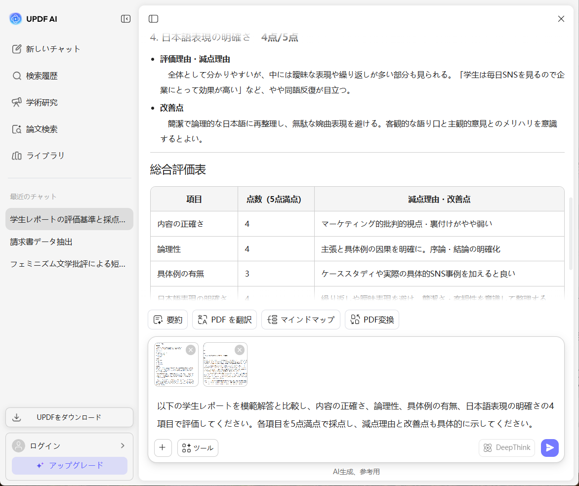 学生の課題と模範解答を(PDF、テキスト、画像)でアップロードします。UPDF AI が採点に必要な内容を自動で認識します。「模範解答に基づいて採点してください」や「誤りと減点箇所を指摘してください」といったプロンプトを使うと、よりスムーズです。