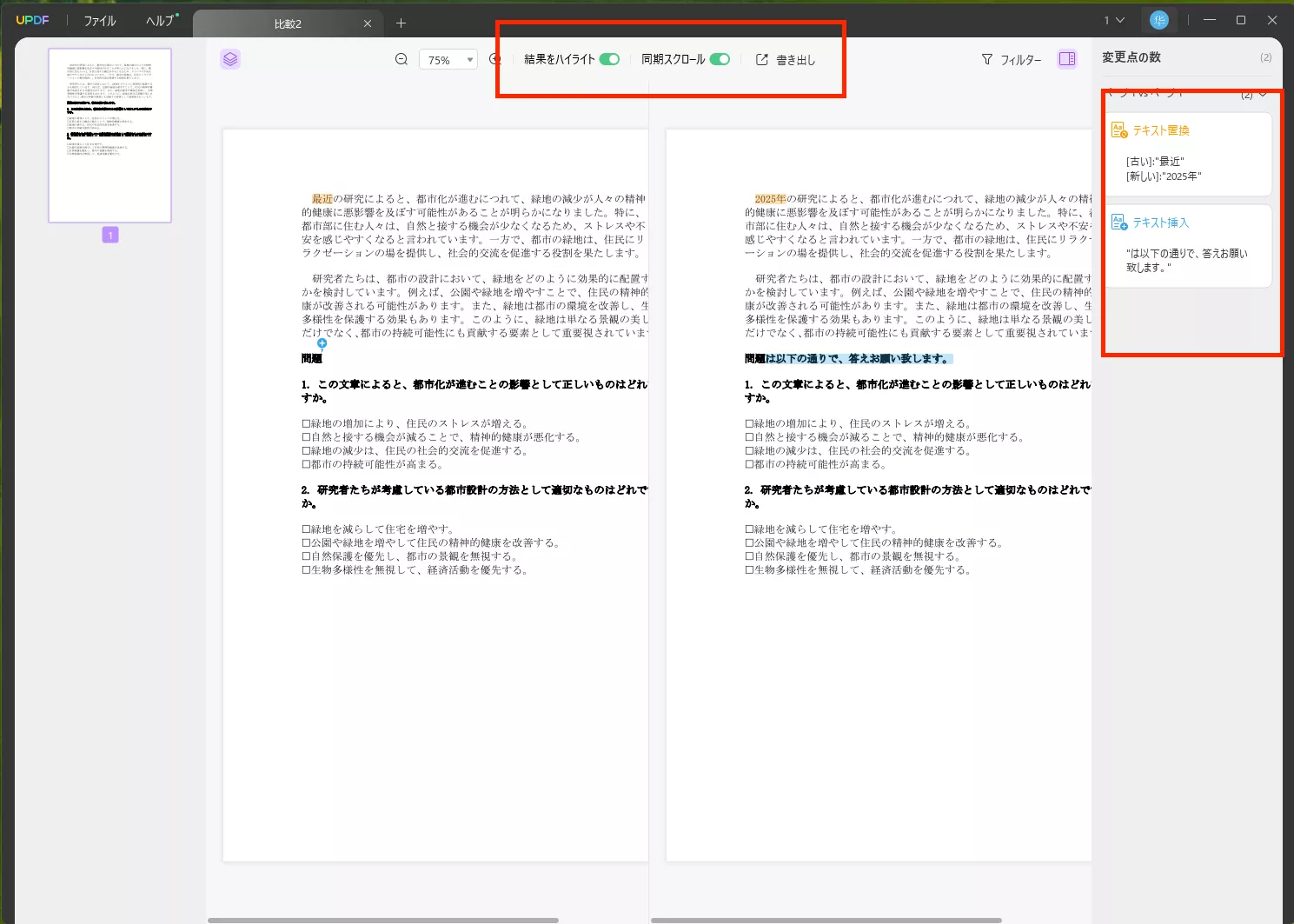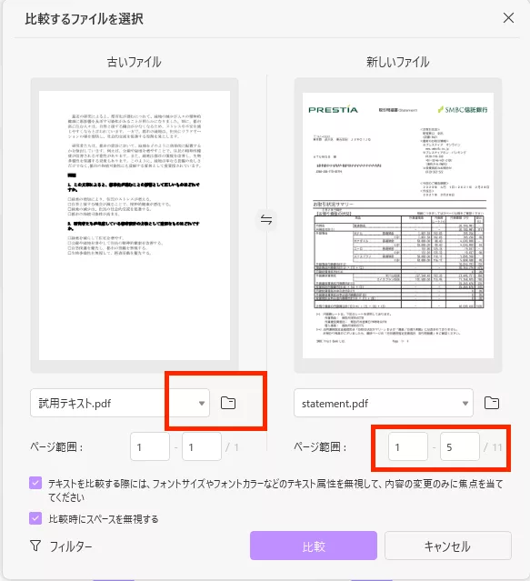 ステップ4. ページ範囲を指定して「比較」をクリックすると、右側のパネルに差分が表示されます。テキストの修正や画像の差し替えなど、PDFに加えられた変更点を直感的に確認できます。