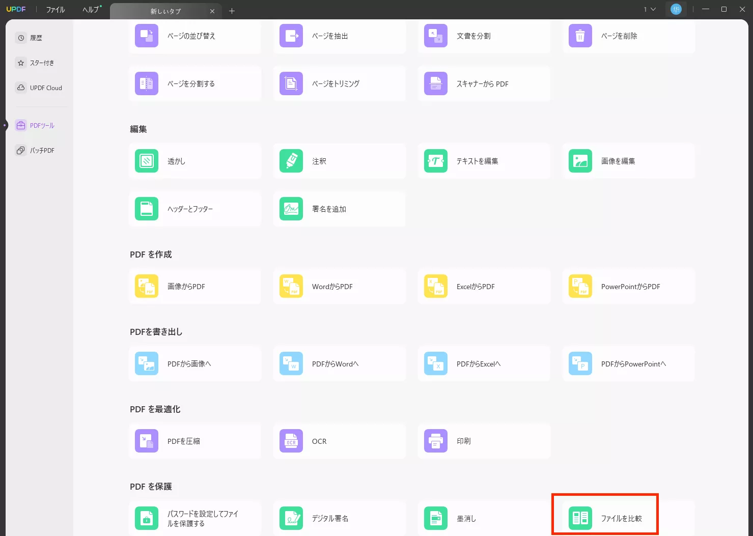 ステップ2. UPDFを起動し、ホーム画面から 「ツール」>「PDFを比較」 を選択します。