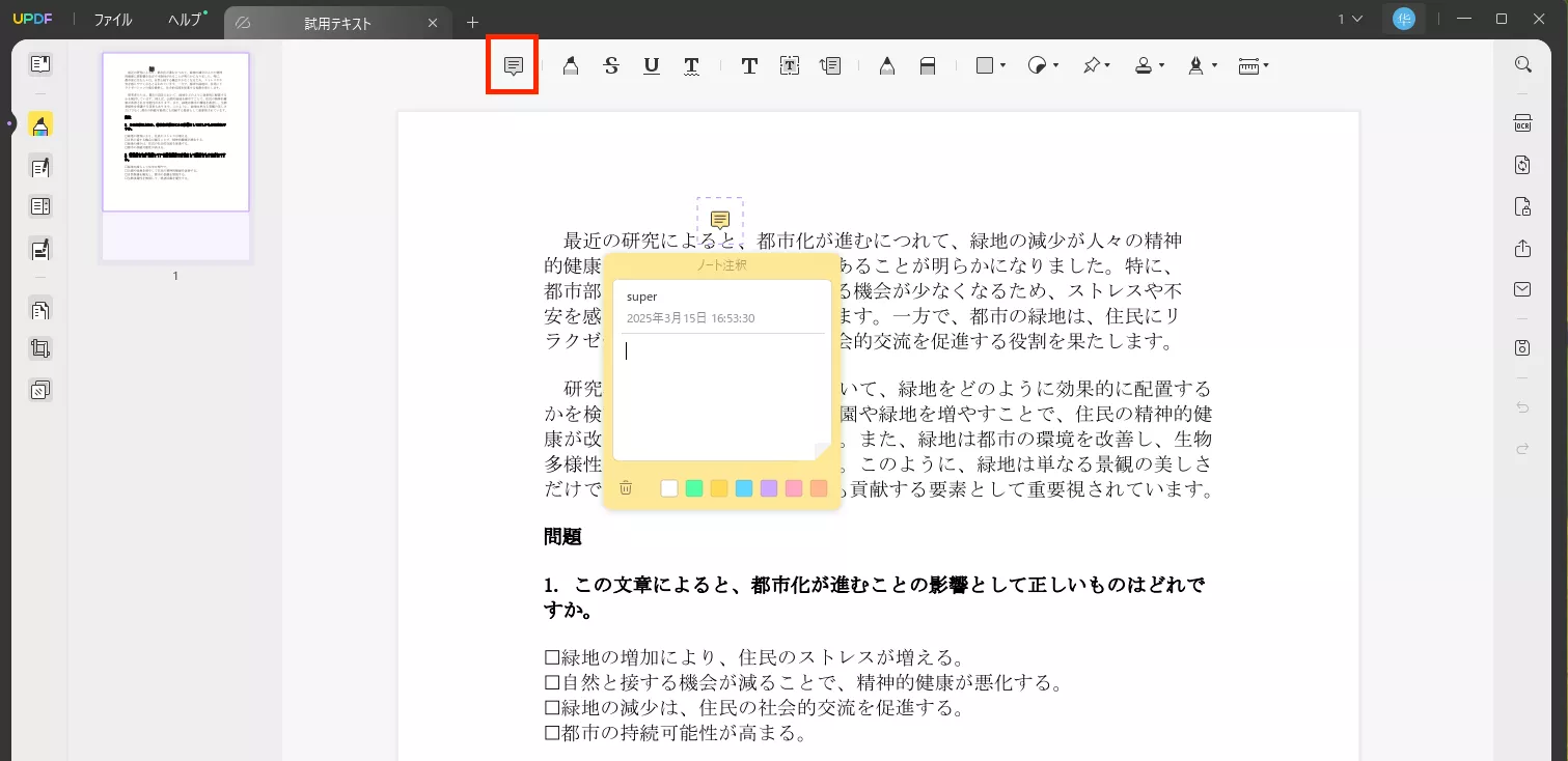 UPDFでメモを取る方法